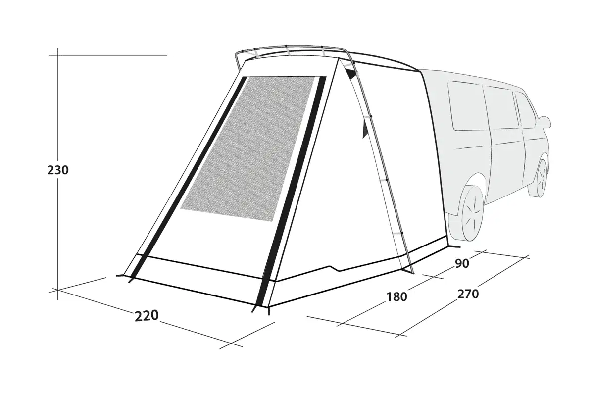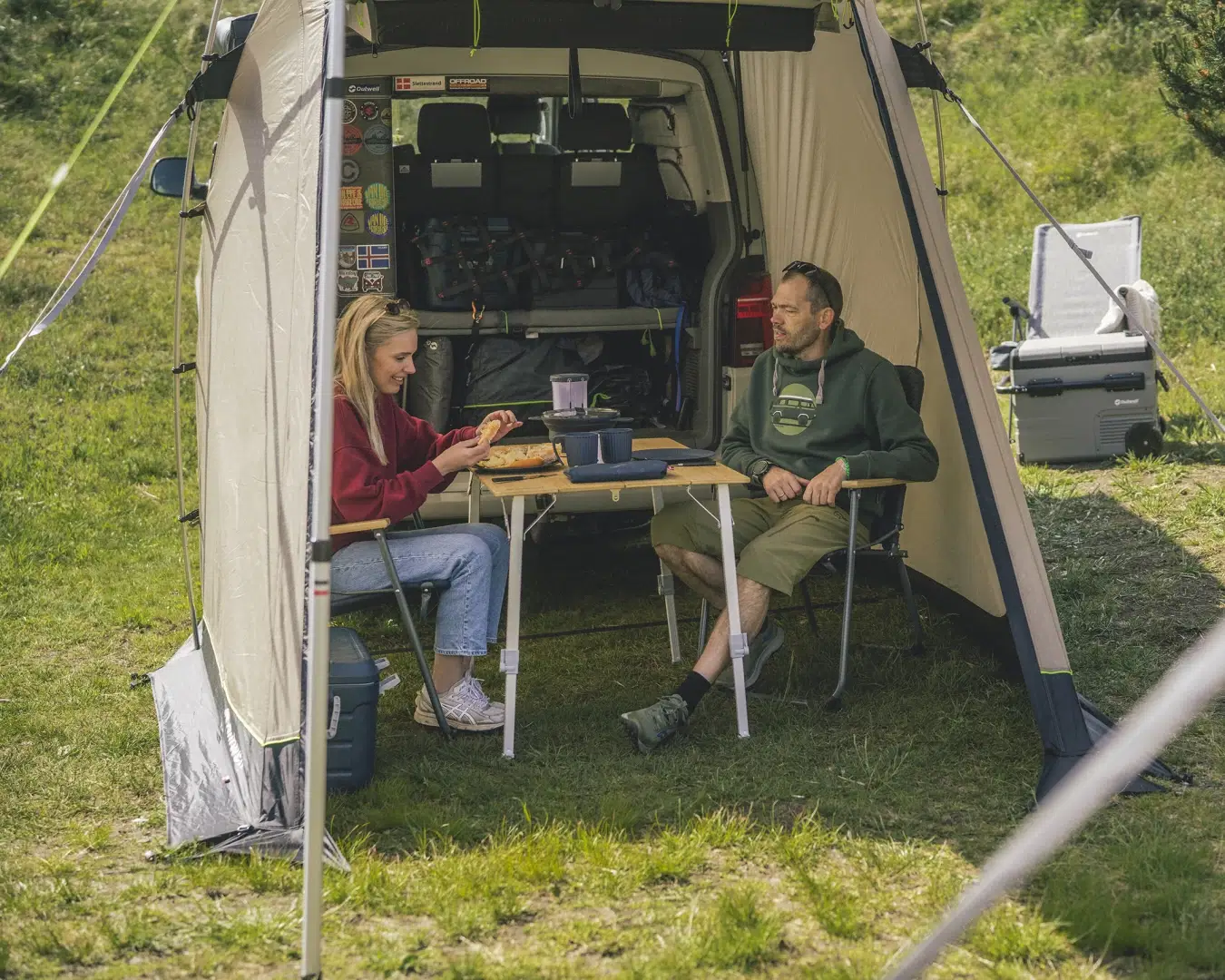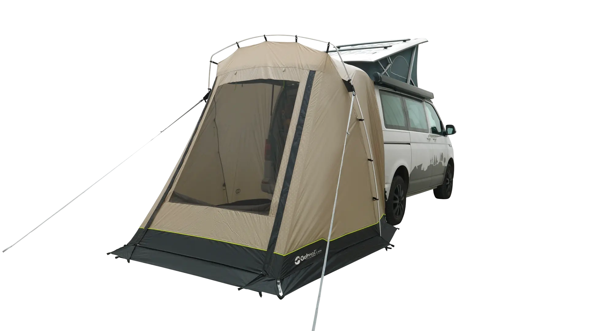 Das Heckzelt ist für die nahtlose Befestigung an beliebten Fahrzeugen wie der VW T5/T6 und der Mercedes-Benz V-Klasse konzipiert und bietet einen geräumigen Wohnbereich für Camping, Familienausflüge oder Picknicks.