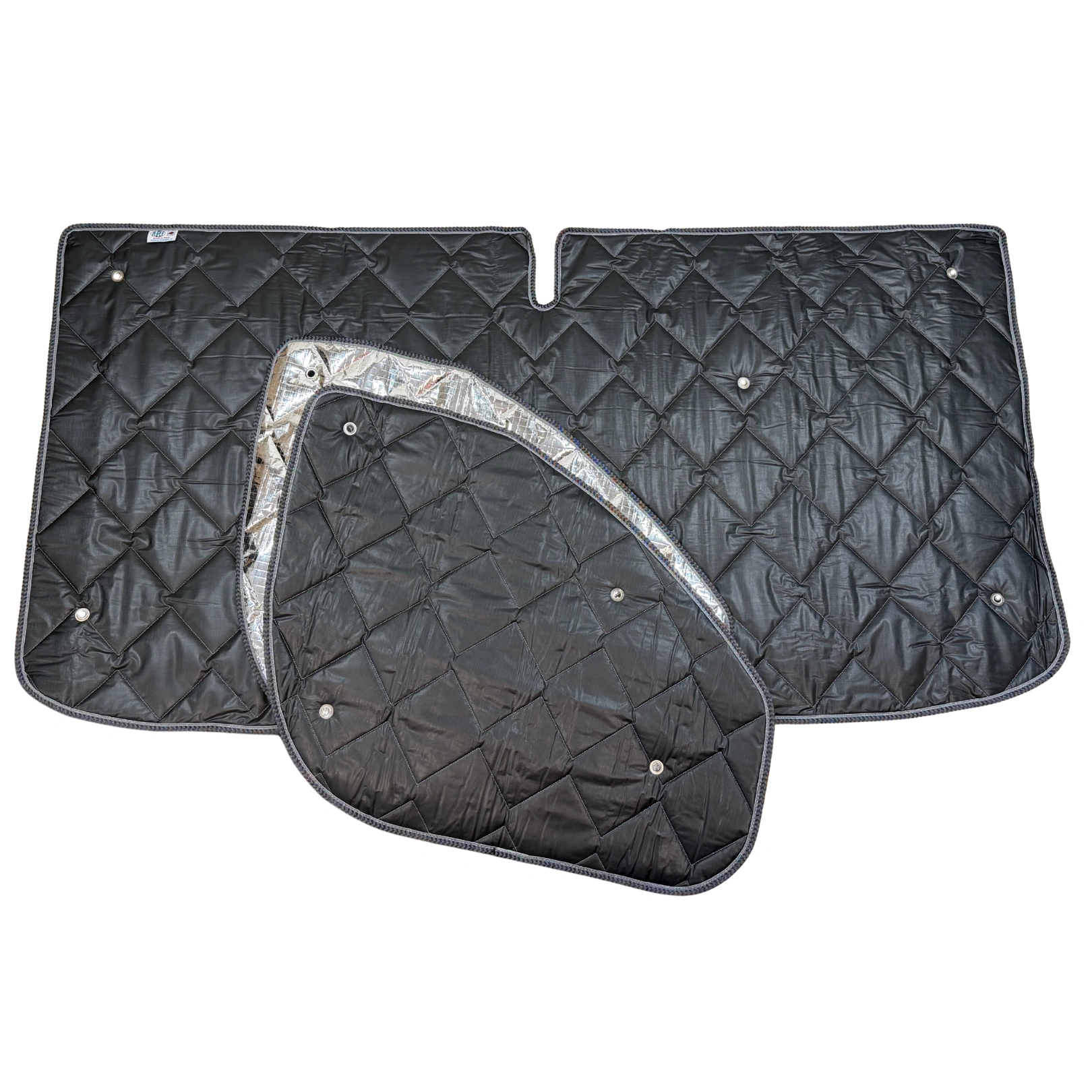 - Set-Inhalt: 1 Matte für Frontscheibe inkl. Spiegelausschnitt, 2 Matten für Fahrer- und Beifahrertür, inkl. Saugnapf-Set und Packtasche