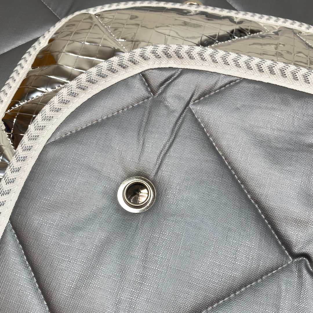 Das Fahrzeug braucht nicht durch Haken verunstaltet werden. Da die Matte durch die Gummisauger direkt an der Scheibe haftet, kann eine 100%ige Reflektierung erzielt werden.