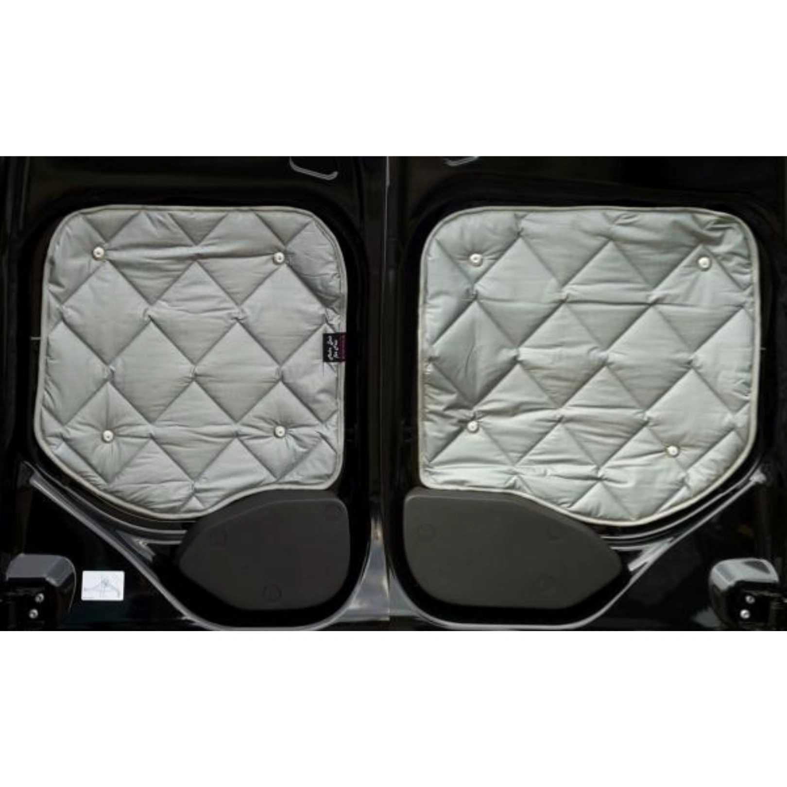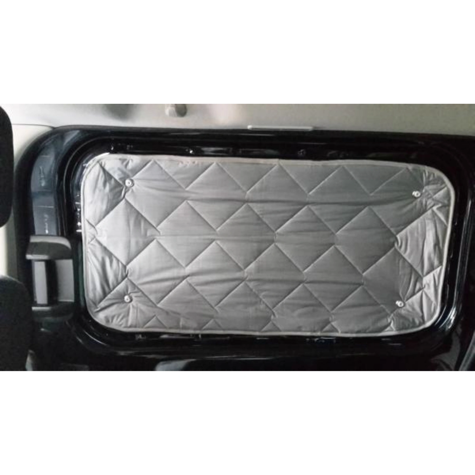 - Bei Fahrzeugen ohne Originalverkleidung um die Fenster ist auf der Fahrerseite hinten links ein Streifen am Fenster schwarz foliert. Hier hält leider kein Saugnapf. Die Thermomatte ist entsprechend kürzer.